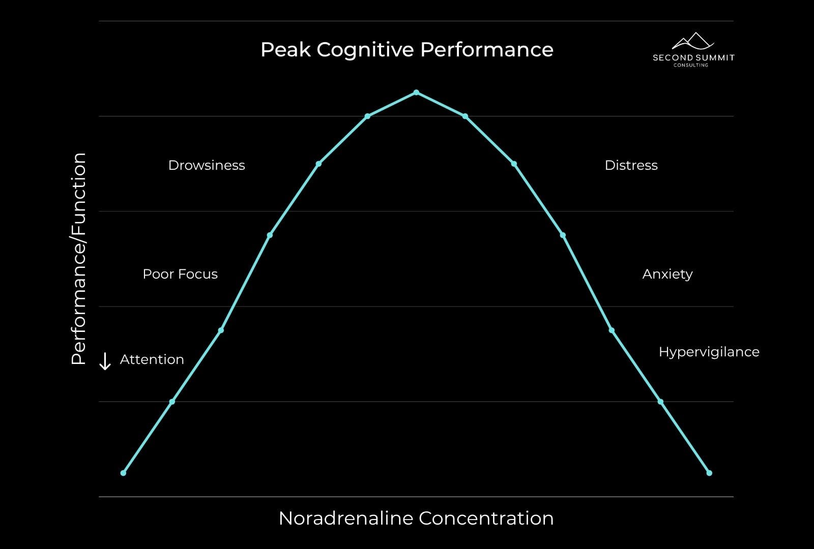 - Noradrenaline operates on an Inverted-U curve where peak performance lives at the apex. Too little leaves you drowsy and unfocused, while too much drives hypervigilance and anxiety. Your goal isn't simply more or less noradrenaline but rather hitting the sweet spot where you're alert and focused without tipping into stress, just like we saw with Dopamine last week.
