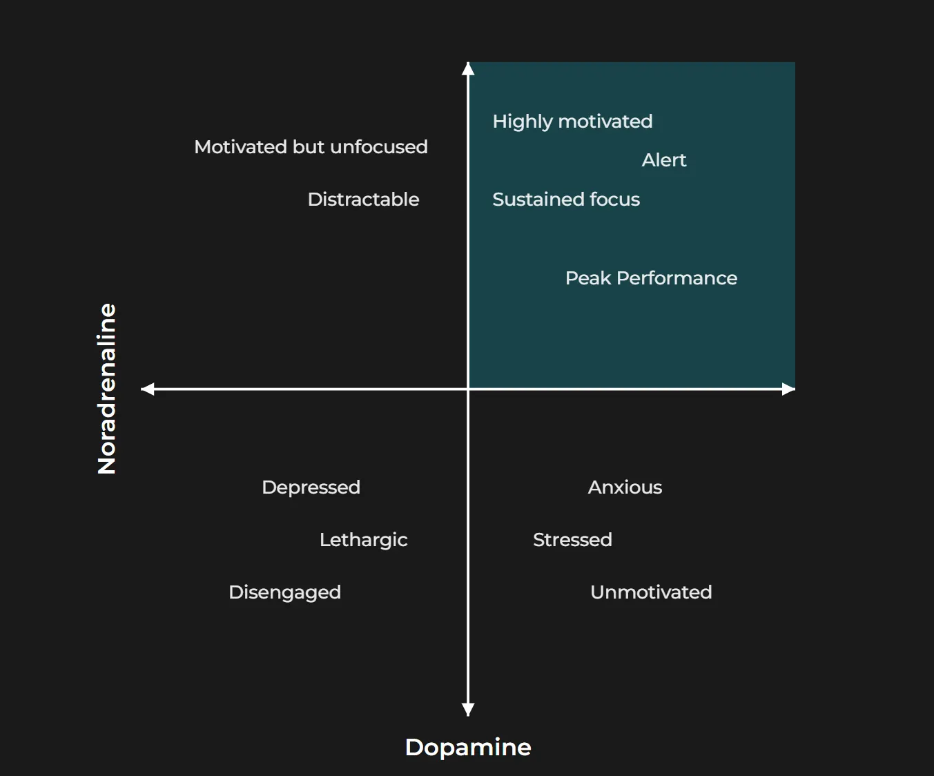 - Noradrenaline and dopamine work as a team, and you can't optimise one without the other. Since noradrenaline is literally made from dopamine, deficiencies in dopamine production cascade into noradrenaline problems. The sweet spot for peak performance is high noradrenaline plus high dopamine, creating that state of motivated, alert, and focused execution we're all chasing.